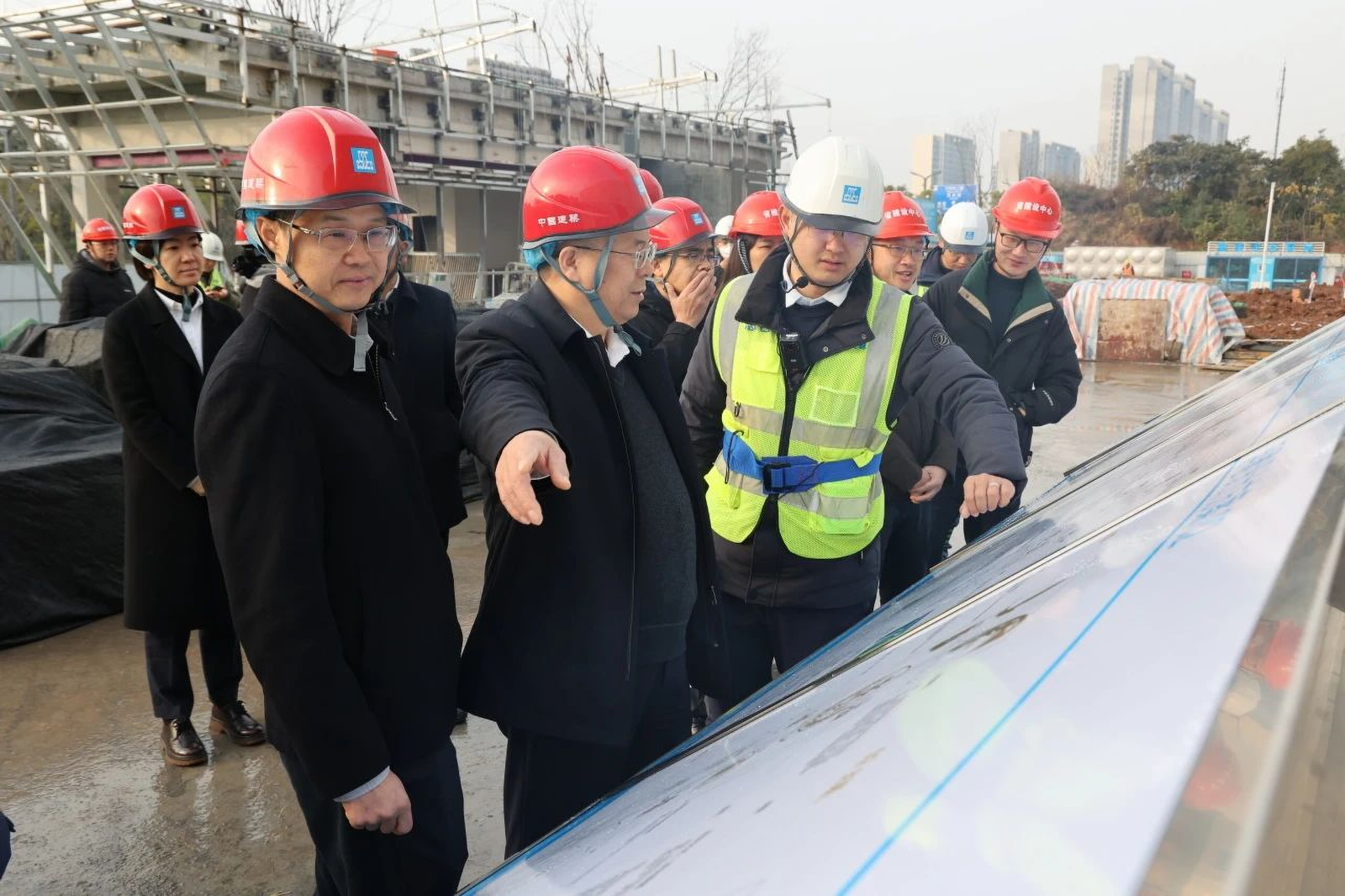 慰问活动前夕,王树江院长等领导深入项目施工现场,实地了解项目建设进展以及下一阶段重点工作。王院长充分肯定了项目现阶段建设成果,对项目后续相关建设任务提出指导性建议。他指出“四川省高级人民法院天府中央法务区审判法庭”项目要严格把好质量关、安全关、进度关,确保高质量、高效率、高标准完成项目建设任务,早日完工投入使用,努力为人民群众提供更加优质高效便捷的司法服务。