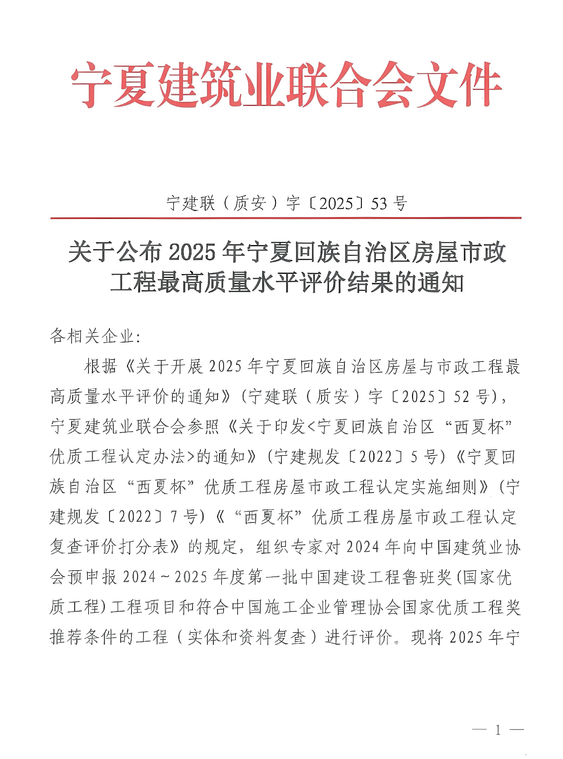 据悉,该评价严格按照《宁夏回族自治区“西夏杯”优质工程房屋市政工程认定实施细则》和《“西夏杯”优质工程房屋市政工程认定复查评价打分表》的规定,由评审机构组织专家从资料完整性、工程实体质量及管理流程等多维度进行综合评审,旨在遴选出代表宁夏地区建筑工程顶尖水平的项目。获评项目将获得推荐申报“中国建设工程鲁班奖”、“国家优质工程奖”等国家级奖项的资格。