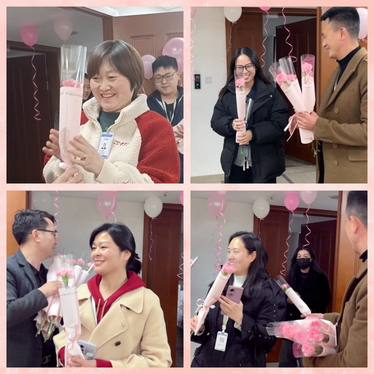 活动在一簇簇鲜花的簇拥下拉开帷幕,行政部特别邀请了几位男神为大家送花,接过鲜花的女神们笑容如春花般灿烂,温暖而耀眼。在这温馨的氛围中,大家相互拍照留念,记录下这难忘的瞬间。
